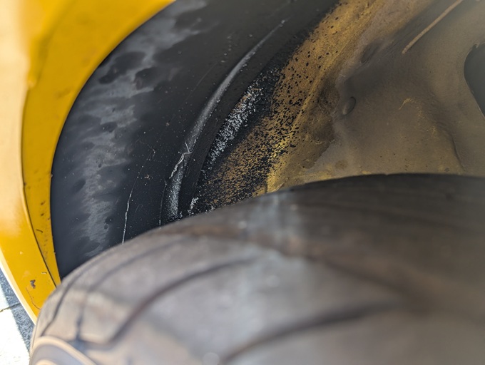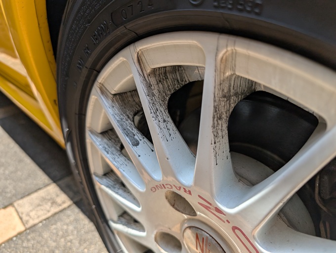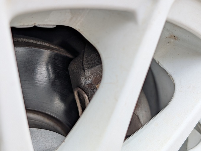 確認し辛いですが、フロントブレーキのローターとパッドの摩擦で結構な異音(ギュコギュコ音)が発生しています。