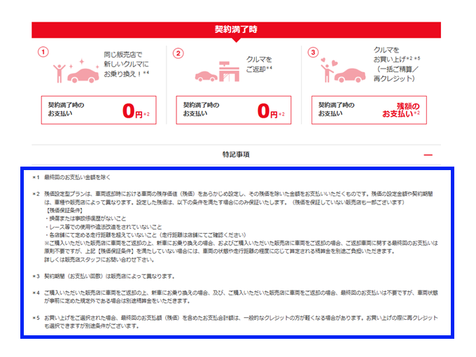 ご購入いただいた販売店に車両をご返却の上、新車にお乗り換えの場合、及び、ご購入いただいた販売店に車両をご返却の場合、最終回のお支払いは不要ですが、車両状態が事前に定めた規定外である場合は別途精算金をいただきます。*5